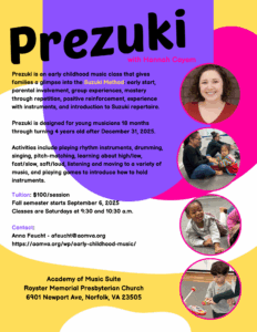 “Prezuki” is an early childhood music class that gives families a glimpse into the Suzuki Method: early start, parental involvement, group experiences, mastery through repetition, positive reinforcement, experience with instruments, introduction to Suzuki repertoire.